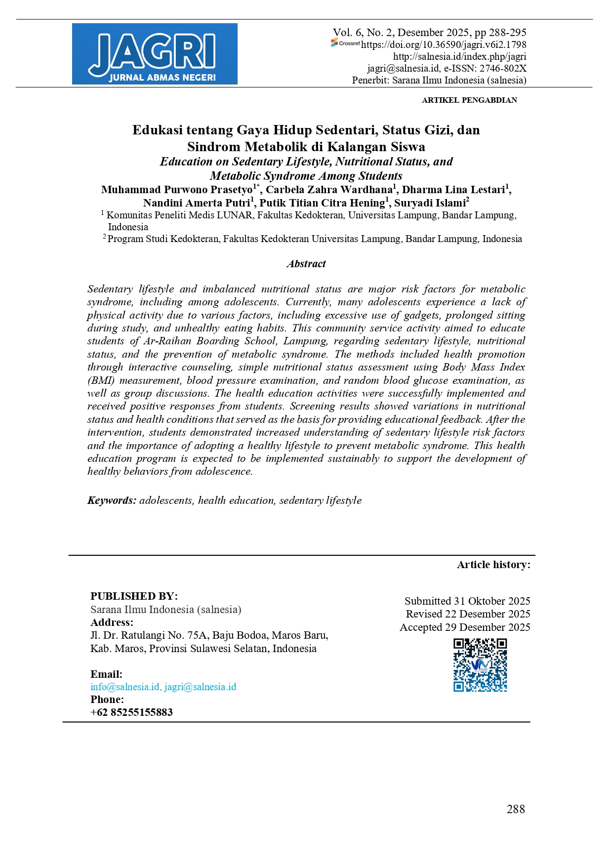 Sedentary lifestyle and imbalanced nutritional status are major risk factors for metabolic syndrome, including among adolescents. Currently, many adolescents experience a lack of physical activity due to various factors, including excessive use of gadgets, prolonged sitting during study, and unhealthy eating habits. This community service activity aimed to educate students of Ar-Raihan Boarding School, Lampung, regarding sedentary lifestyle, nutritional status, and the prevention of metabolic syndrome. The methods included health promotion through interactive counseling, simple nutritional status assessment using Body Mass Index (BMI) measurement, blood pressure examination, and random blood glucose examination, as well as group discussions. The health education activities were successfully implemented and received positive responses from students. Screening results showed variations in nutritional status and health conditions that served as the basis for providing educational feedback. After the intervention, students demonstrated increased understanding of sedentary lifestyle risk factors and the importance of adopting a healthy lifestyle to prevent metabolic syndrome. This health education program is expected to be implemented sustainably to support the development of healthy behaviors from adolescence.