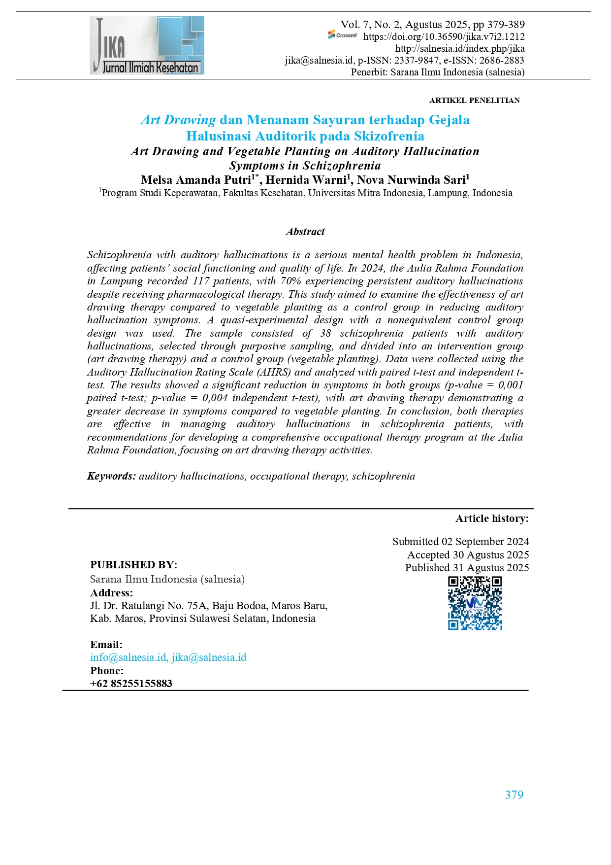 Schizophrenia with auditory hallucinations is a serious mental health problem in Indonesia, affecting patients’ social functioning and quality of life. In 2024, the Aulia Rahma Foundation in Lampung recorded 117 patients, with 70% experiencing persistent auditory hallucinations despite receiving pharmacological therapy. This study aimed to examine the effectiveness of art drawing therapy compared to vegetable planting as a control group in reducing auditory hallucination symptoms. A quasi-experimental design with a nonequivalent control group design was used. The sample consisted of 38 schizophrenia patients with auditory hallucinations, selected through purposive sampling, and divided into an intervention group (art drawing therapy) and a control group (vegetable planting). Data were collected using the Auditory Hallucination Rating Scale (AHRS) and analyzed with paired t-test and independent t-test. The results showed a significant reduction in symptoms in both groups (p-value = 0,001 paired t-test; p-value = 0,004 independent t-test), with art drawing therapy demonstrating a greater decrease in symptoms compared to vegetable planting. In conclusion, both therapies are effective in managing auditory hallucinations in schizophrenia patients, with recommendations for developing a comprehensive occupational therapy program at the Aulia Rahma Foundation, focusing on art drawing therapy activities.
